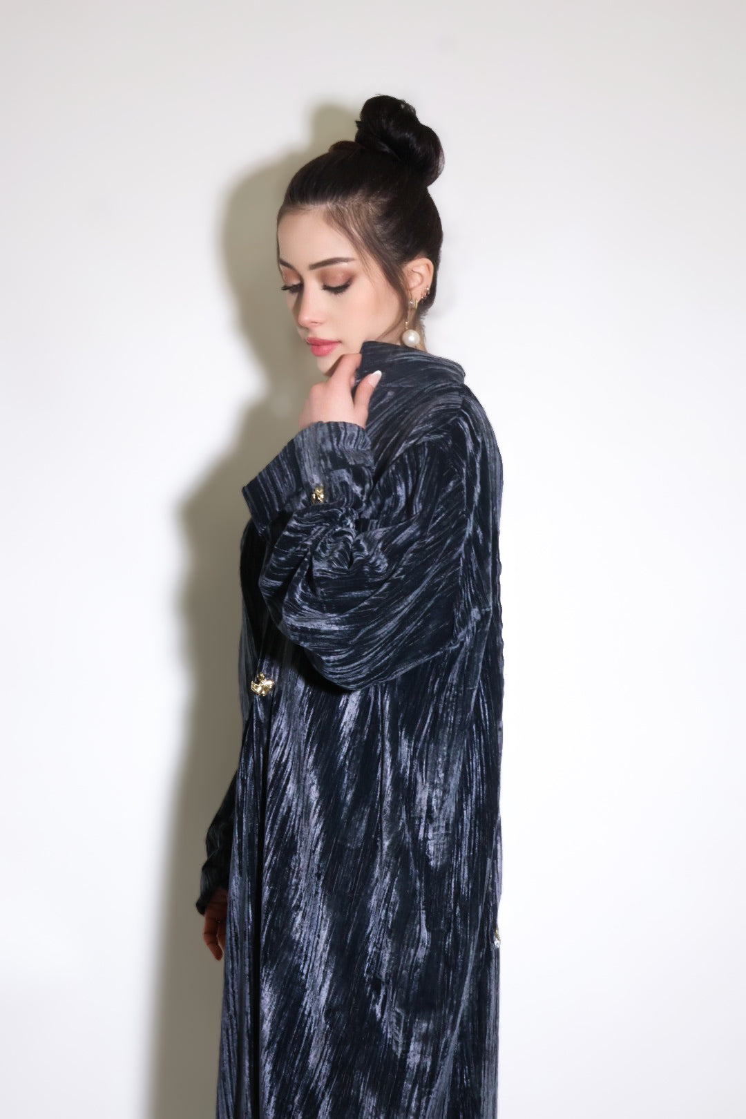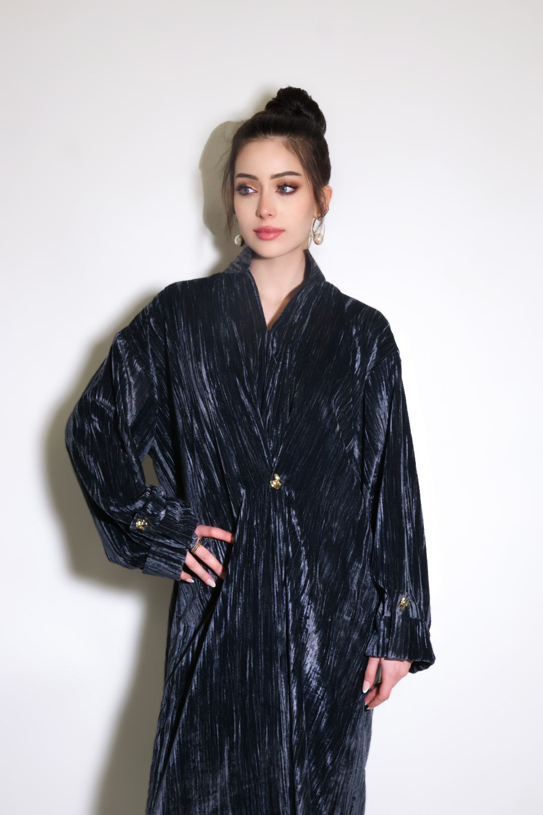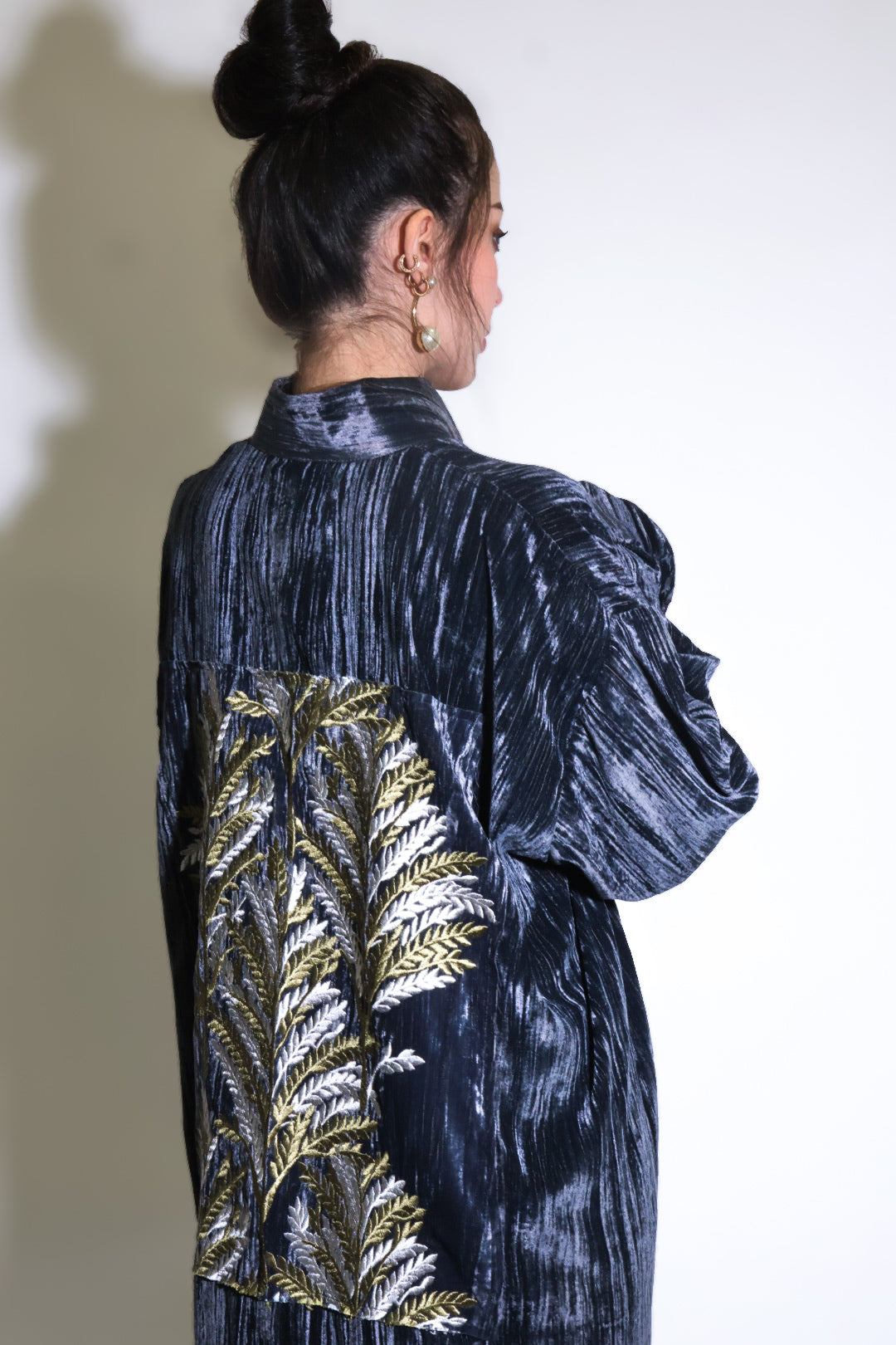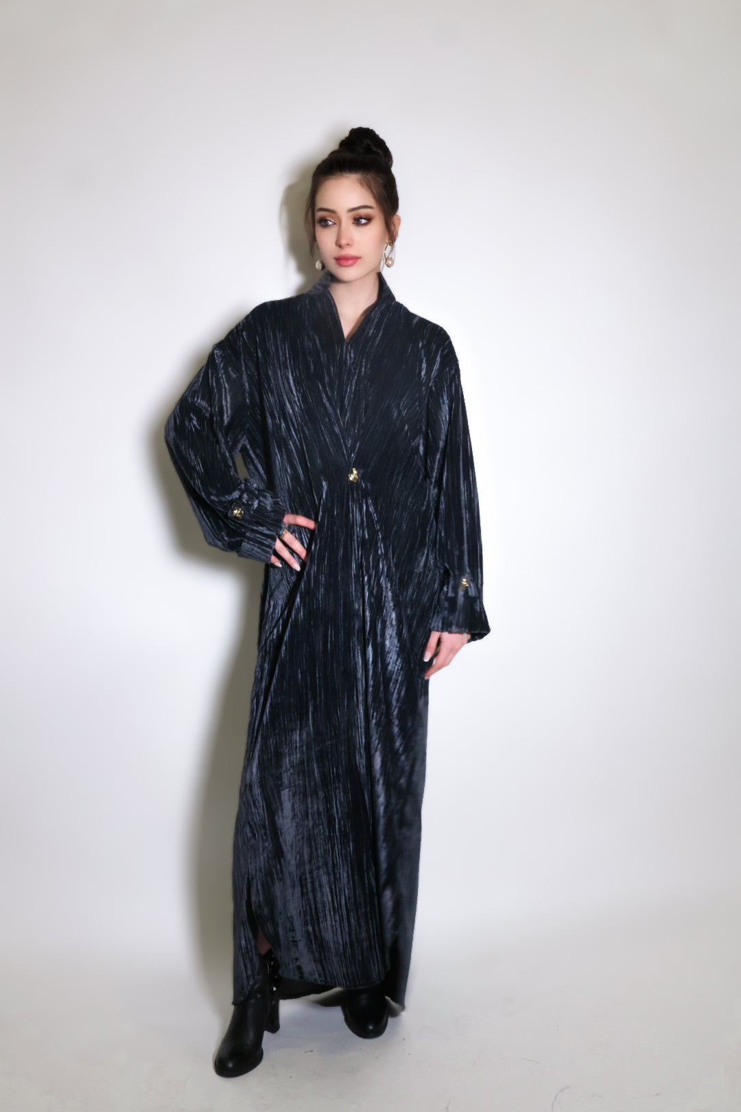 Flowing velvet kaftan with gold buttons, side slits and an embroidered back panel.